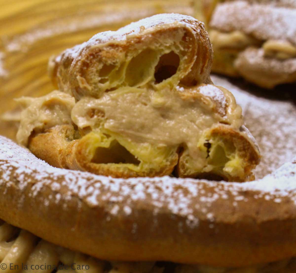 Con un cuchillo de sierra cortar la rosca, y rellenar con una manga pastelera la crema de praliné, se usa normalmente una boquilla de estrella (así se llama) Llevar a la nevera para enfriar. En mi caso, no la puse en la nevera pues tenía que hacer la foto, luego del corte si fue al frío.