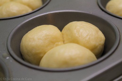 Pasado este tiempo, engrasamos con mantequilla el molde de muffin. Dividimos la masa en tres partes iguales y cada una de ellas en 12 bolitas pequeñas.