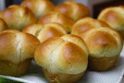 Precalentar el horno a 190ºC. Hornear 15 minutos hasta que estén dorados. A mitad de cocción podemos girar la bandeja. Retirar y pincelar con un cucharada de mantequilla derretida cuando están calientes. Se sirven tibios.